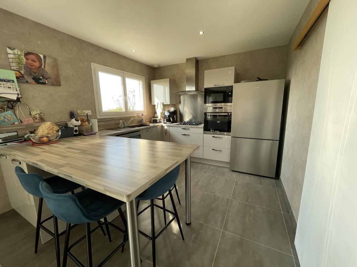 Coquette VILLA récente de PLAIN-PIED (98 m² hab), bien entretenue et prête à habiter, comprenant: cuisine équipée ouverte sur pièce de vie lumineuse et donnant sur terrasse (sud), espace nuit composé de 3 chambres, salle de bains (baignoire, douche et double vasque), wc séparé. Grand sous-sol composé d’un garage double (56 m²) et d’une grande cave (vide sanitaire avec belle hauteur).